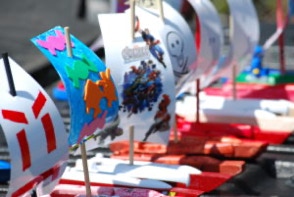 The regatta boat is made from 100% recycled materials and can be decorated in any way desired. At the regatta, the boats are raced in pairs on raingutter courses propelled by the boys and girls blowing into the sails.